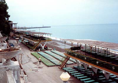 であるが、約8割は森林と公園であり、黒海沿岸には人口海岸とホテル群が連なり、各種サナトリウムが山間部に建並んでいる。ソチの中心地区は樹木と花に埋めつくされた美しいリビエラ公園で市民の為の図書館や劇場などがあり、保養シーズンには人で埋まるほどの混雑である。市街地の大通りは遊歩道として整備され、噴水や花壇などのオープンスペースが数多くある。帝政時代の壮麗な建物、イタリア風の階段式庭園などが見られ、どこか南仏的雰囲気が感じられる。 |